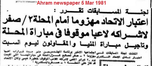 7 Mar 1981 Menia 1-1 Mekawleen (Hamdi Abdel Ali 90") (Mohamed Radwan 58")