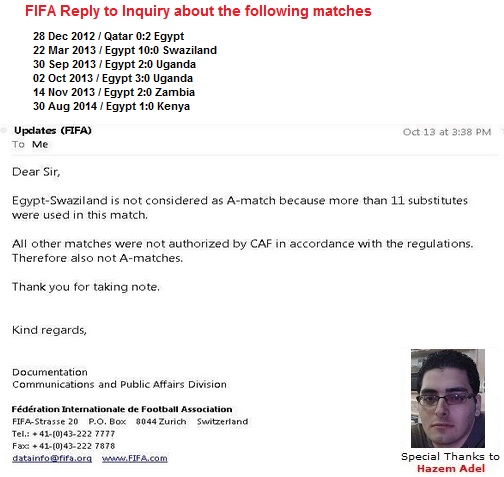 - 22 Mar 2013 / Egypt 10:0 Swaziland / Home / Friendly93- 26 Mar 2013 / Egypt 2:1 Zimbabwe / Home / World Cup Qualifiers